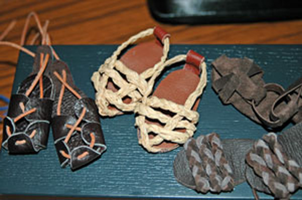 Viele der Armen gingen in der biblischen Zeit vermutlich barfuß, insofern sind Schuhe sicher nicht das wichtigste Bekleidungsstück. Die normalen Schuhe waren einfache Sandalen, die aus einem Stück Leder in der Größe des Fußes gemacht wurden und mit einem langen Lederstreifen versehen waren der zwischen dem großen und dem zweiten Zeh verlief und um den Knöchel gebunden wurde. ![]() Trotzdem möchten viele Kursteilnehmer auch etwas andere Schuhe herstellen und Schuhe sind bei den Stellungen oft ein schönes Detail. In der Bibel selbst werden Schuhe häufig erwähnt. Die bekannteste Stelle ist vermutlich 2. Mose 3,5 als Gott zu Mose sagt: "Zieh deine Schuhe aus, der Ort auf dem du stehst ist heilig". | Schmuckstand im Basar in der Alt Stadt von Jerusalem. |