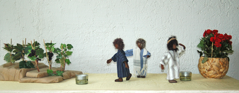 Politikern um, aber auch in der Kirche und bei uns selber. Jesus spricht dieses Gleichnis zu den Pharisäern. Er hält ihnen ein Spiegel vor das Gesicht. Seht her, ihr gebt euch zwar als gottesfürchtig, aber setzt ihr das auch um?? Handelt ihr nach euren Aussagen? Bei der Figurenstellung haben wir drei Männer gestellt. Der Ältere der Vater, der ein Gebetsschal trägt. Beide Söhne wenden sich ab. Einer geht in die Entgegengesetzte Richtung des Weinbergs und fasst sich an den Kopf, als Zeichen dass es ihm zu dumm ist das ganze. Der Andere geht zunächst vom Weinberg weg, lenkt aber seine Schritte wieder in die Richtung des Berges. ![]() | ![]() am See Genezareth Lasst uns zurückkehren zu dem Herrn: Er hat zerrissen- und Er wird heilen, Er schlägt und Er verbindet. So lasst uns erkennen, ja lasst uns streben, Gott zu erkennen! Säet Gerechtigkeit, erntet Liebe! Denn so ist Sein Wort: "Liebe verlange ich, nicht Opfer, Gotteserkenntnis, nicht Brandopfer." Jüdisches Gebet |